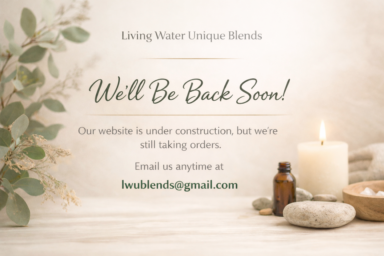 Our unique blends are carefully handmade keeping sensitive skin in mind and are made to order for freshness. Delivery options and payment methods are generous and flexible. Browse through our product collection and experience shopping with Living Water Unique Blends for yourself. Please don’t hesitate to contact us with questions, comments or suggestions.